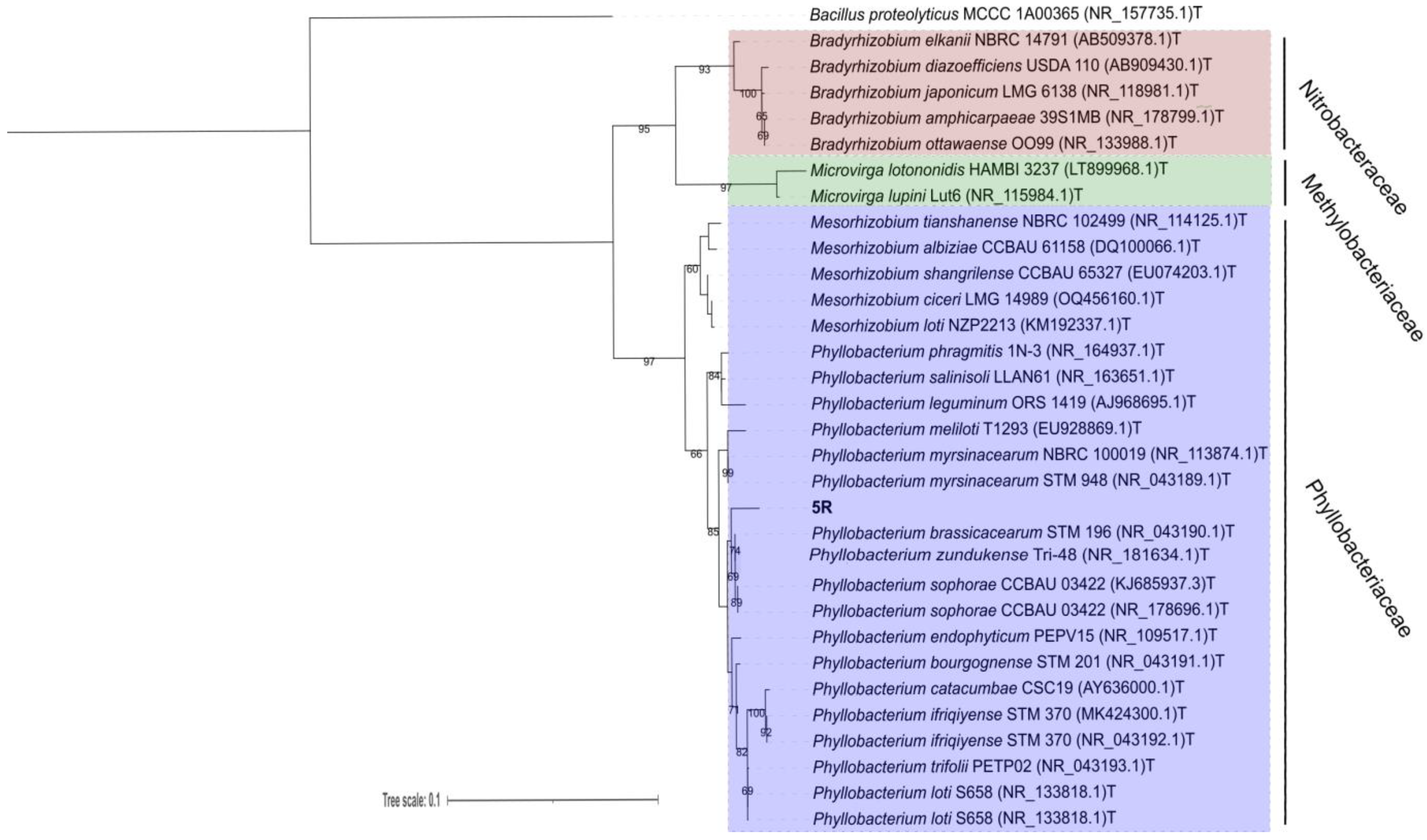 - Mousavi, S.A.; Willems, A.; Nesme, X.; De Lajudie, P.; Lindström, K. Revised phylogeny of Rhizobiaceae: Proposal of the delineation of Pararhizobium gen. nov., and 13 new species combinations. Syst. Appl. Microbiol. 2015, 38, 84–90. [Google Scholar] [CrossRef]