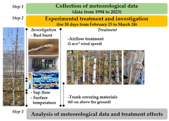 The Jangsu region is a major apple-producing area in South Korea, with approximately 850 hectares cultivated with apple trees [34]. Analyzing historical weather patterns in key apple cultivation regions offers critical insights for formulating future cultivation strategies and implementing effective measures to mitigate the impacts of extreme weather events. Global climate change has significantly affected growing seasons of fruit trees, contributing to the occurrence of meteorological and physiological disorders at various growth stages. In particular, low-temperature damage during the early spring bud burst and flowering periods in apples has become increasingly unpredictable, with no effective countermeasures currently available. Although traditional approaches, such as covering tree trunks, have been employed to prevent frost damage, these approaches have notable limitations. This study aims to provide insights into mitigating desiccation and low-temperature damage during the dormant and bud burst stages of ‘Fuji’ apples. Specifically, it investigates the effect of trunk covering materials combined with continuous airflow treatments during February and March, a critical period when cold tolerance is gradually lost.