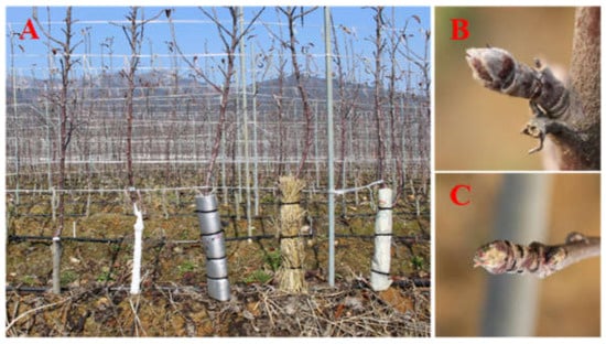 Photographs of the trunk covering (A) and determination of bud burst in ‘Fuji’ apples. (A): Covering materials, from left to right, are untreated, whitewash, foam insulation, rice straw, and newspaper. (B,C) Show dormant and bud burst flower buds, respectively. The bud burst period was determined when the bud scale of flower buds was separated by more than 2 mm.