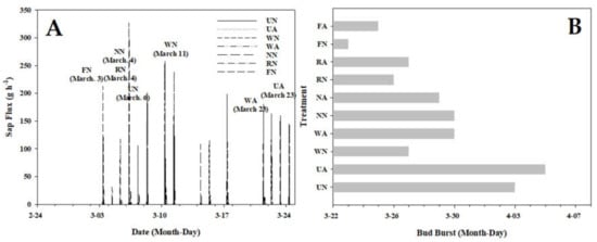 2.5. Observation of Bud Burst and Measurement of Xylem Sap Flow