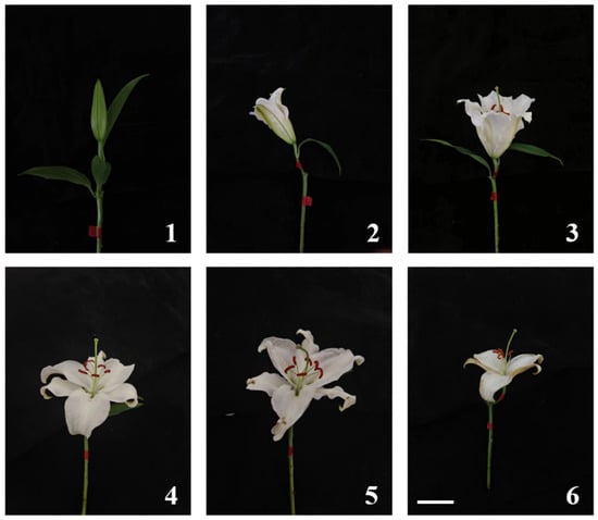 The six stages of postharvest cut lily flowers based on the appearances and status. (1) ‘loose bud stage’ or ‘opening-engaged stage’; (2) ‘newly-open stage’; (3) ‘half-open stage’; (4) ‘fully-open stage’; (5) ‘incipient senescence stage’; (6) ‘wilting stage’ or ‘declined stage’. Scale bar = 5 cm.
