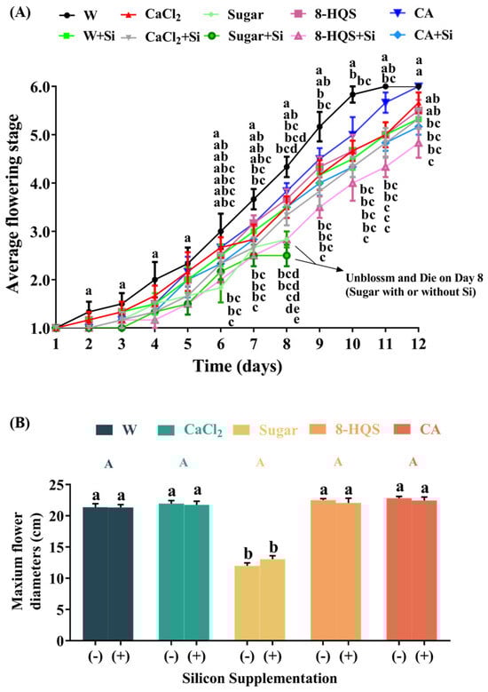 The cut lily flowers treated with water only (‘W’) showed earlier on average flowering stages and a significantly shorter vase life compared with other treatments on Day 6, particularly the Si-added groups (Figure 3A). The cut lily flowers in the ‘W’ group developed approximately one and two flowering stages, respectively, ahead of those in Si-deficient groups (in addition to ‘W + Si’) and Si-sufficient groups (Figure 3A). Meanwhile, with the exception of ‘Sugar’ groups, it is worthy to note that the additions of Si to the corresponding Si-deficient groups markedly extend one flowering stage (Figure 3A). Interestingly, the cut lily plants treated with ‘CaCl2 + Si’ displayed a highly analogous flowering stage curve to that displayed by ‘CA + Si’-treated flowers on Day 6 (Figure 3A).