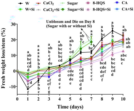 Fresh weight loss per stem in response to treatments during the 10 days of vase life. The displayed data are means ± SE for n = 9 biological replicates. The significant differences among treatments were determined according to Duncan’s multiple comparison range test (one-way ANOVA), when p was less than 0.05, and were denoted by different lowercase letters over and below lines. ‘(−)’ and ‘(+)’ refer to no silicon and supplemented silicon, respectively.