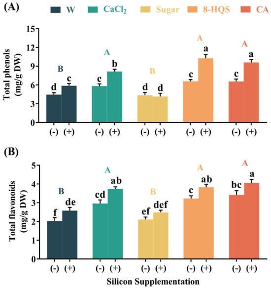 The concentrations of non-enzymatic antioxidant compounds in the fallen petals, including total phenols and total flavonoids, were determined (Figure 5). The cut stems treated with CaCl2, 8-HQS, or CA significantly showed higher total phenols and total flavonoids compared with those treated with water and sugar, regardless of the addition or not of Si.