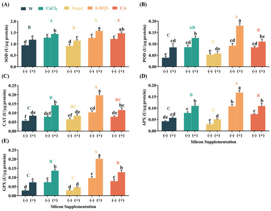As shown in Figure 6, the supplementation of Si notably increased the investigated antioxidant enzymes concentration, with the exception of the ‘Sugar’ group. Taking the POD activity of the 8-HQS group as an example, the addition of Si to the 8-HQS vase solution significantly increased the activity by 97.8% relative to that observed in the Si-deficient solution (Figure 6B). In addition, the 8-HQS vase solution resulted in remarkably higher activity for CAT, APX, and GPX than other treatments, regardless of any Si additions (Figure 6C–E). Meanwhile, the additions of both 8-HQS and Si to the vase solution significantly improved the SOD, POD, CAT, APX, and GPX activity by 68.1%, 3.62-fold, 2.52-fold, 3-fold, and 6.21-fold, respectively, compared with the cut stems cultured in ‘W’ (Figure 6).