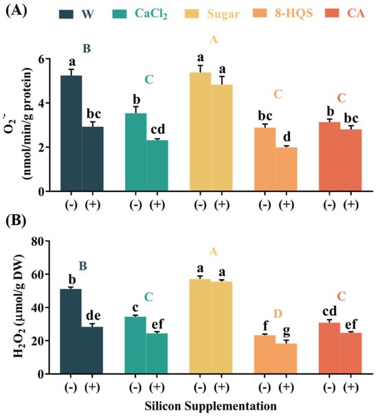 As shown in Figure 7, similarly to above, except for the sugar group, the plants treated with vase solutions with added Si showed significant decreases in both O2− and H2O2 accumulations, compared with their Si-deficient counterparts. There was a more pronounced effect; the additions of both 8-HQS and Si to the vase solutions resulted in a dramatic decline in H2O2 by 64.1%, compared with plants treated with ‘W’ only (Figure 7B).