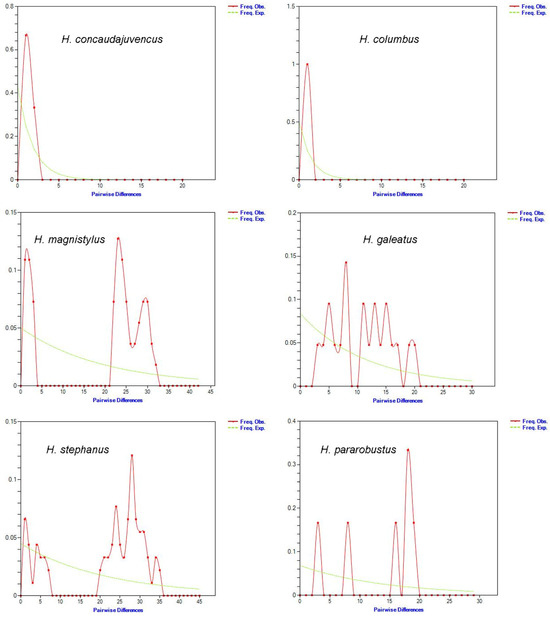 - Rogers, A.R.; Harpending, H. Population growth makes waves in the distribution of pairwise genetic differences. Mol. Biol. Evol. 1992, 9, 552–569. [Google Scholar] [PubMed]