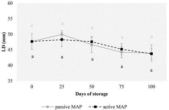Therefore, the chosen time/temperature combination was effective in maintaining the same LD parameter after drying, according to Mayor e Sereno [55], who observed, under conditions of high temperature and reduced hot air exposure, different rates of water diffusion from the inside to the outside of the flesh. In this way, strong moisture gradients are formed in the material, which inhibit shrinkage during drying [55]. Instead, after the drying process LD decreased steadily (p ≥ 0.05) up to D100 for both MAP treatments (Figure 1). On the last day of analysis (D100), the dried orange slices lost 7.80% in passive MAP and 8.32% in active MAP. However, although storage in active MAP showed no significant differences (p ≥ 0.05) compared with passive MAP treatment during 100 days of storage, the presence of N2 seems to have maintained the initial characteristics of the bags, according to Passafiume et al. [56].
