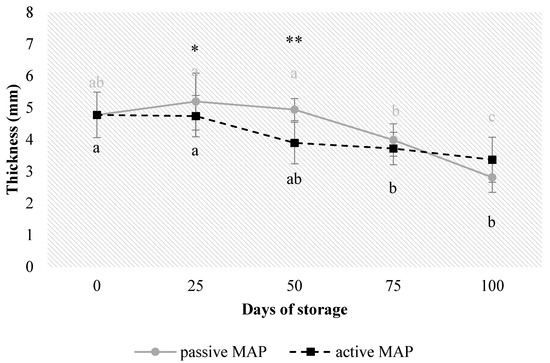 Thickness expressed in mm for dried blood orange slices during 100 days of storage in active and passive MAP. Results indicate the mean values ± standard deviation (S.D.). Different letters and different colours of the letters represent significant differences (p ≤ 0.05) on individual treatments for each day of storage; asterisks indicate significant differences between MAP treatments with * for p ≤ 0.05, ** for p ≤ 0.01; no asterisk indicates no significant differences between treatments.