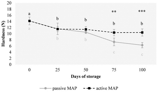 Hardness expressed in N for dried blood orange slices during 100 days of storage in active and passive MAP. Results indicate the mean values ± standard deviation (S.D.). Different letters and different colours of the letters represent significant differences (p ≤ 0.05) on individual treatments for each day of storage; asterisks indicate significant differences between MAP treatments with ** for p ≤ 0.01, *** for p ≤ 0.001; no asterisk indicates no significant differences between treatments.