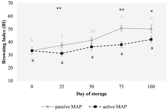 Browning index for dried blood orange slices during 100 days of storage in active and passive MAP. Results indicate the mean values ± standard deviation (S.D.). Different letters and different colours of the letters represent significant differences (p ≤ 0.05) on individual treatments for each day of storage; asterisks indicate significant differences between MAP treatments with * for p ≤ 0.05, ** for p ≤ 0.01; no asterisk indicates no significant differences between treatments.