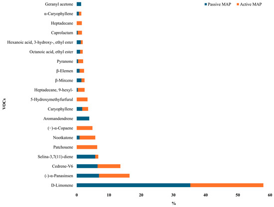 Dried orange slices treated with two different gas concentrations (active MAP and passive MAP) were analyzed using the HS–SPME–GC–MS analytical method. The composition and relative amounts of volatile organic compounds (VOCs) are shown in Figure 5.
