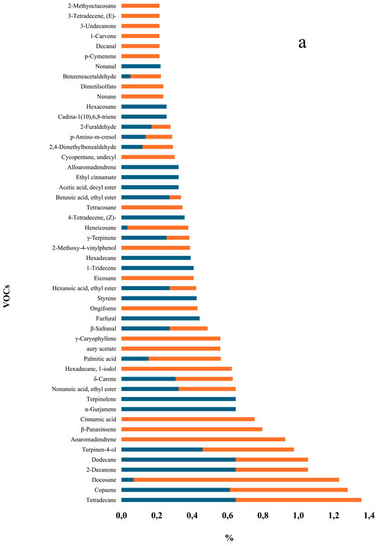 VOCs (%) detected in dried orange slices with Passive MAP and Active MAP treatments. (Panel (a) highlights VOC concentrations ranging from 0% to 1.4% while Panel (b) highlights those from 0% to 0.3%).