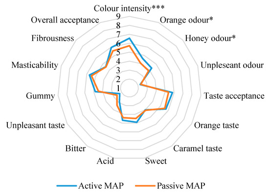 The sensory analysis results are presented in Figure 6, highlighting significant differences in three attributes: color intensity, orange aroma, and honey aroma. The active MAP sample exhibited significantly higher color intensity (p < 0.001) compared to the passive MAP sample. Additionally, the orange and honey aromas were rated higher in the active MAP samples, indicating noteworthy differences (p < 0.05), as noted by the tasting panel. The two samples were perceived as similar in other attributes considered by the panel. Overall, attributes such as taste acceptance, sweetness, acidity, gumminess, masticability, and overall acceptance received higher scores for the active MAP sample, although these differences were not statistically significant. The panel reported lower ratings for any unpleasant tastes or odors, indicating that none were specifically identified. Based on responses from the affective test following the descriptive test, only 3% of participants reported consuming dried fruit almost daily, 14% consumed it several times a month, 50% consumed occasionally, and 33% did not consume dried fruit at all.