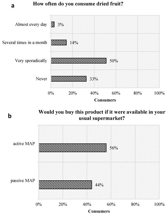 (a) percentage of consumers who have selected different dehydrated fruit consumption habits, (b) intention to purchase dried blood orange slices depending on the conservation treatment (active e passive MAP).