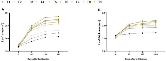 Leaf area of Stauntonia leucantha continuously increased under all treatments from 0–180 d after fertilization (Table 3). The LA of all fertilized treatments was higher than the non-fertilized treatments (Figure 1A). The LA increased the fastest in 0–60 d after fertilization, slowed down in 60–120 d, and was almost constant from 120–180 d (Figure 1A). The LA reached a maximum value of 28.59 cm2 in T9 treatment, with an increase rate of 78%, and a minimum value of 20.66 cm2 in T1 treatment, with an increase rate of 23%.
