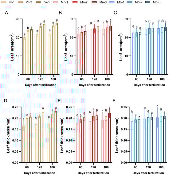 The effect of zinc (Zn), manganese (Mn), and molybdenum (Mo) co-fertilization on leaf area and leaf thickness of Stauntonia leucantha leaves at 60, 120, and 180 days. (A) Effects of different Zn fertilization levels on leaf area at 60, 120, and 180 days. (B) Effects of different Mn fertilization levels on leaf area at 60, 120, and 180 days. (C) Effects of different Mo fertilization levels on leaf area at 60, 120, and 180 days. (D) Effects of different Zn fertilization levels on leaf thickness at 60, 120, and 180 days. (E) Effects of different Mn fertilization levels on leaf thickness at 60, 120, and 180 days. (F) Effects of different Mo fertilization levels on leaf thickness at 60, 120, and 180 days. Different colored columns represent the average values of the metabolite under different levels of micronutrients. Vertical bars above the mean indicate the standard error of replicates. Different lowercase letters represent significant differences by the Duncan’s multiple range test (p < 0.05, n = 3). Zn-1, Zn-2, and Zn-3 mean 0 g, 3 g, and 6 g of Zn fertilizer application; Mn-1, Mn-2, and Mn-3 mean 0 g, 3 g, and 6 g of Mn fertilizer application; Mo-1, Mo-2, and Mo-3 mean 0 g, 1.5 g, and 3 g of Mo fertilizer application.