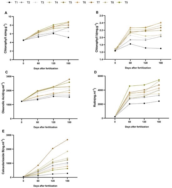 Chlorophyll a content showed a continuous increase under most treatments (Figure 3A). In contrast, the chlorophyll a content under treatments T1 and T3 decreased slightly within the 120–180 days. Chlorophyll b content increased most rapidly within 0–60 days (Figure 3B). The chlorophyll content increased slowly within 60–120 days and even slightly decreased in the T3 and T4 treatments. In addition, the chlorophyll b content of all fertilized treatments increased between 120 and 180 days. OA content showed a continuous increase within 180 days (Figure 3C). The content of OA increased at a gradually slowing rate over time, but T7, T8, and T9 showed a higher increment between 120 and 180 days. Similarly, rutin content showed a continuous increase (Figure 3D), with the most rapid increase between 0 and 60 days, almost no increase between 60 and 120 days, and a slight increase between 120 and 180 days. Similarly, the content of calceolarioside B also showed continuous growth (Figure 3E), but the increase was most rapid between 60 and 120 days.
