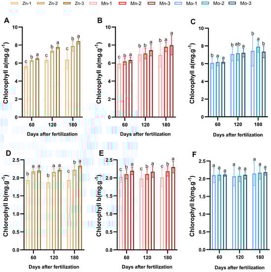 The effect of zinc (Zn), manganese (Mn), and molybdenum (Mo) co-fertilization on chlorophyll a and chlorophyll b content of Stauntonia leucantha leaves at 60, 120, and 180 days. (A) Effects of different Zn fertilization levels on chlorophyll a content at 60, 120, and 180 days. (B) Effects of different Mn fertilization levels on chlorophyll a content at 60, 120, and 180 days. (C) Effects of different Mo fertilization levels on chlorophyll a at 60, 120, and 180 days. (D) Effects of different Zn fertilization levels on chlorophyll b content at 60, 120, and 180 days. (E) Effects of different Mn fertilization levels on chlorophyll b content at 60, 120, and 180 days. (F) Effects of different Mo fertilization levels on chlorophyll b content at 60, 120, and 180 days. Different colored columns represent the average values of the metabolite under different levels of micronutrients. Vertical bars above the mean indicate the standard error of replicates. Different lowercase letters represent significant differences by the Duncan’s multiple range test (p < 0.05, n = 3). Zn-1, Zn-2, and Zn-3 mean 0 g, 3 g, and 6 g of Zn fertilizer application; Mn-1, Mn-2, and Mn-3 mean 0 g, 3 g, and 6 g of Mn fertilizer application; Mo-1, Mo-2, and Mo-3 mean 0 g, 1.5 g, and 3 g of Mo fertilizer application.