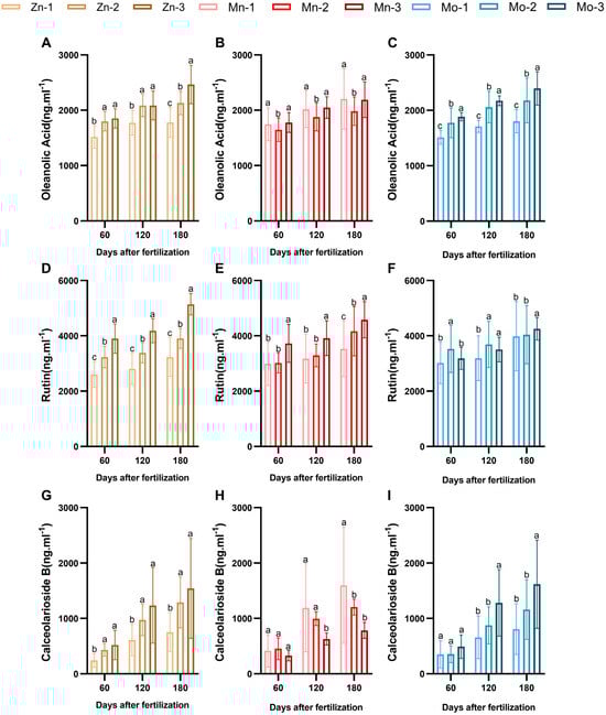 The effect of zinc (Zn), manganese (Mn), and molybdenum (Mo) co-fertilization on oleanolic acid, rutin, and calceolarioside B content of Stauntonia leucantha leaves at 60, 120, and 180 days. (A) Effects of different Zn fertilization levels on oleanolic acid a content at 60, 120, and 180 days. (B) Effects of different Mn fertilization levels on oleanolic acid content at 60, 120, and 180 days. (C) Effects of different Mo fertilization levels on oleanolic acid at 60, 120, and 180 days. (D) Effects of different Zn fertilization levels on rutin content at 60, 120, and 180 days. (E) Effects of different Mn fertilization levels on rutin content at 60, 120, and 180 days. (F) Effects of different Mo fertilization levels on rutin content at 60, 120, and 180 days. (G) Effects of different Zn fertilization levels on calceolarioside B content at 60, 120, and 180 days. (H) Effects of different Mn fertilization levels on calceolarioside B content at 60, 120, and 180 days. (I) Effects of different Mo fertilization levels on calceolarioside B content at 60, 120, and 180 days. Different colored columns represent the average values of the metabolite under different levels of micronutrients. Vertical bars above the mean indicate the standard error of replicates. Different lowercase letters represent significant differences by the Duncan’s multiple range test (p < 0.05, n = 3). Zn-1, Zn-2, and Zn-3 mean 0 g, 3 g, and 6 g of Zn fertilizer application; Mn-1, Mn-2, and Mn-3 mean 0 g, 3 g, and 6 g of Mn fertilizer application; Mo-1, Mo-2, and Mo-3 mean 0 g, 1.5 g, and 3 g of Mo fertilizer application.