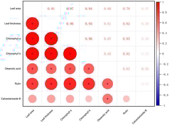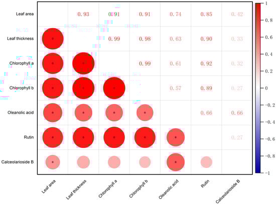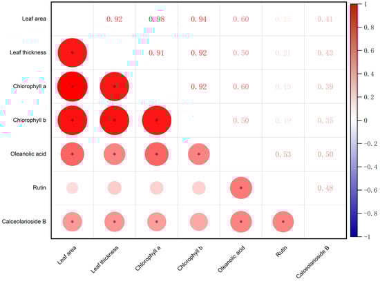 At 60 days after fertilization (Figure 6), the correlation between the LA and LT as well as the content of chlorophyll a, chlorophyll b, OA, and rutin in the leaves of Stauntonia leucantha under co-fertilization of Zn, Mn, and Mo was determined to be significant (p < 0.05). The LT was significantly correlated with the content of chlorophyll a, chlorophyll b, OA, and rutin (p < 0.05), indicating that an increase in LA and LT may promote the accumulation of metabolic substances and photosynthetic pigments within the leaves. Both chlorophyll a and b contents significantly correlated with the OA and rutin content (p < 0.05), suggesting that the accumulation of photosynthetic pigments during this period significantly affected the OA and rutin metabolism. Additionally, calceolarioside B content was significantly correlated with the OA and rutin content (p < 0.05).