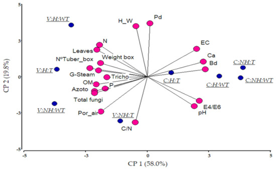 Biplot of the PCA applied to the set of variables measured on the plants, substrates, and mini tubers produced in the trial. Where C: compost; V: vermicompost; NH: non-heat; H: heat treatment; T: with T. asperelllum; WT: without T. asperelllum.