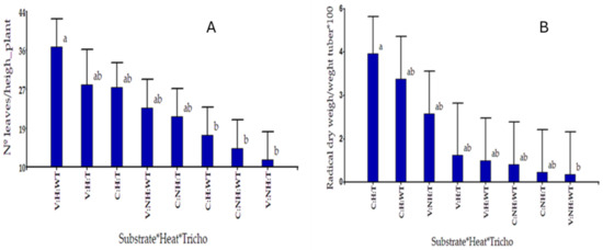Effect of the factors: substrate type, heat treatment, and inoculation with T. asperellum on the physiological growth indices of potato plants. Number of leaves/plant height (A) and root dry weight/total number of mini tubers (B) and measured two months after planting. C: compost; V: vermicompost; NH: non-heat; H: heat treatment; T: with T. asperelllum; WT: without T. asperelllum. Different letters indicate significant differences at p ≤ 0.05 according to LSD test.