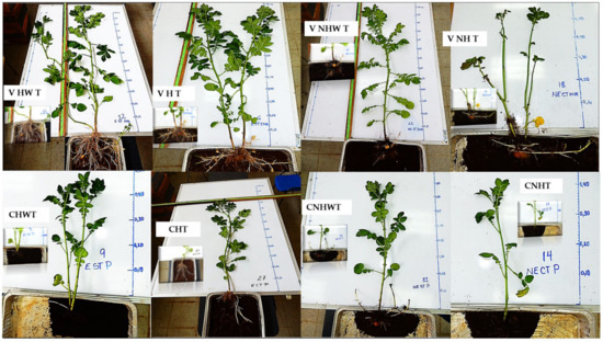 Differential aspects of potato plants developed under the treatments applied in the trial. C: compost; V: vermicompost; NH: non-heat; H: heat treatment; T: with T. asperelllum; WT: without T. asperelllum.