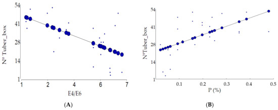 Adjustment of the linear regression analysis for the variable number of mini tubers per box against the variables (A) E4/E6 proportion and (B) P concentration in the substrate as regressor variables.