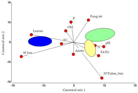 The study of plant biometric variables, substrate characteristics, and their interactions is crucial for understanding the complex relationships between plants and their growing environment. This research paper aims to investigate the effects of various treatments on plant biometric variables and substrate characteristics, as well as the interactions between these factors. The composition of compost can vary significantly depending on the materials from which it is derived, leading to diverse effects on plant growth and disease suppression [35,36]. Compost can directly provide plants with essential nutrients, while also indirectly influencing the soil microbiome in ways that promote plant health and protect against pathogens [37,38,39]. Several studies have highlighted the benefits of compost application to soil. Compost can help reduce the financial costs associated with chemical fertilizers and mitigate the environmental impacts of their production and use [38]. Furthermore, compost-amended soils have shown significant improvements in overall soil health compared to untreated soils [38]. The physical, chemical, and biological properties of the growth medium are crucial factors that shape the complex web of interactions decisive for the development and agronomic performance of crops [40,41,42,43]. Linear Discriminant Analysis (LDA) was employed to identify the minimal set of variables capable of effectively discriminating between groups and establishing quality ranges, as illustrated in Figure 5. The analysis suggests that biological and chemical variables were the most influential in the observed response, as they could not be disregarded, unlike other factors such as apparent density or real density.