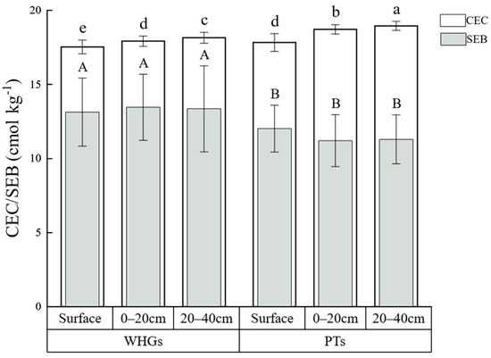 The soil cation exchange capacity (CEC) and soil exchangeable salts base (SEB) at different depths in WHGs and PTs. The different lowercase letters (capital letters) indicate significant differences among treatments (p < 0.05).