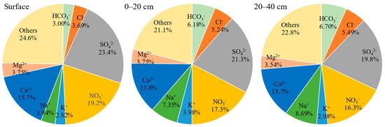 As shown in Figure 4, the combined proportion of anions and cations in OPVs constituted approximately 77% of total water-soluble ions across all investigated layers, suggesting a significant presence of other ion species. Sulfate (SO42−) and nitrate (NO3−) were the dominant anions, while Ca2+ was the primary cation, and CO32− was not detected. In the soil surface, 0–20 cm, and 20–40 cm layers, SO42− accounted for 23.4%, 21.3%, 19.8%, NO3− accounted for 19.2%, 17.3%, 16.3%, and Ca2+ accounted for 15.7%, 13.8%, 13.7% of total ions, respectively. The percentage of SO42−, NO3−, and Ca2+ on the surface was higher than in deeper soil, showing a decreasing trend from top to bottom. There was a typical characteristic of upward movement with water and accumulation on the surface. Conversely, Na+ and Cl− exhibited an opposite distributional tendency, with a rising trend from top to bottom, showing a distinct leaching process. The higher proportion of NO3− coincided with the elevated nitrate-nitrogen content of OPVs depicted in Figure 5. In addition, the sum of anions was about 50%, while the sum of cations was only about 27%, implying the potential presence of unmeasured water-soluble cations in OPV soil.