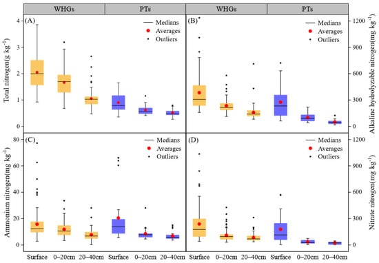 Soil total nitrogen (A), alkaline hydrolyzable nitrogen (B), ammonium nitrogen (C) and nitrate nitrogen (D) at different depths in WHGs and PTs.