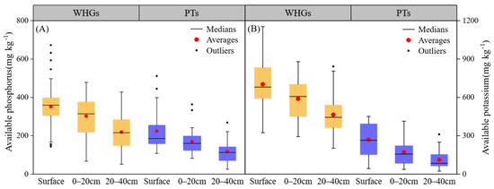 Soil available phosphorus (A) and available potassium (B) at different depths in WHGs and PTs.