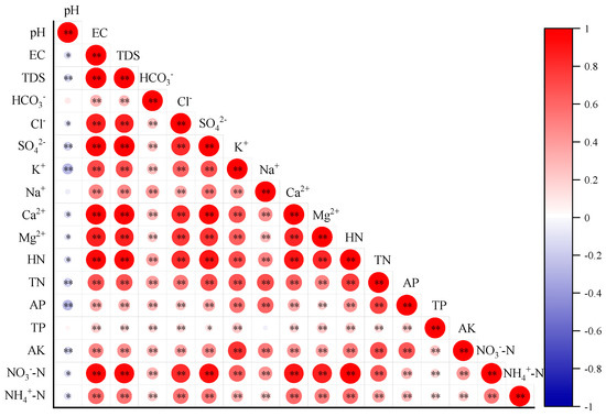 Heatmap of Pearson correlation coefficients between some soil salinity indicators and nutrient indicators. Salinity indicators include pH, electrical conductivity (EC), total water-soluble salt (TDS), and water-soluble HCO3−, Cl−, SO42−, K+, Na+, Ca2+, and Mg2+. Nutrient indicators include alkaline hydrolyzable nitrogen (HN), total nitrogen (TN), available phosphorus (AP), total phosphorus (TP), available potassium (AK), nitrate nitrogen (NO3−-N), ammonium nitrogen (NH4+-N). Significant differences: * p < 0.05, ** p < 0.01.