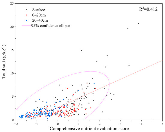A scatter plot was generated to visualize the relationship between the nutrient comprehensive evaluation score (horizontal axis) and total water-soluble salt (vertical axis). The data for the three soil depths (surface, 0–20 cm, and 20–40 cm) were clearly distinguished. As shown in Figure 8, nutrient scores exhibited a gradual increase from deeper to surface layers, mirroring a similar trend for salinity. This observation further reinforces the positive correlation between soil salinity and nutrients within OPVs. The fitted regression line yielded a determination coefficient (R2) of 0.412. Notably, 95% of sample points fell inside the confidence ellipse, and those that fell outside the ellipse mostly were surface samples, which showed that there was a certain degree of specificity in surface soil. Both nutrient and salinity in surface soil were higher, the data points were the most dispersive, and the data fluctuated most.