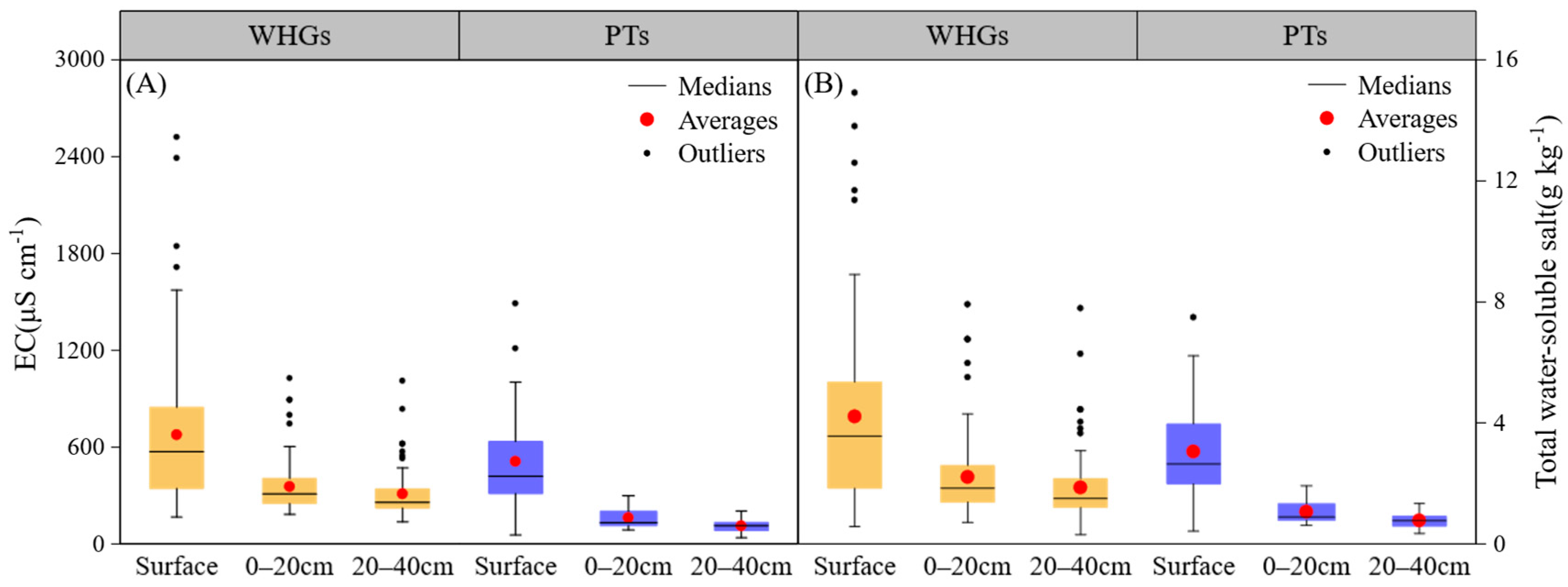 Soil EC (A) and total water-soluble salt (B) at different depths in WHGs and PTs.