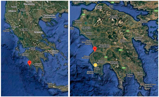 The location of the two provinces in Greece, in Messinia county (on the left). On the right a closer aspect of the area is depicted, where Pylia (yellow tag) and Raches (red tag) provinces are shown (produced by Google Maps).