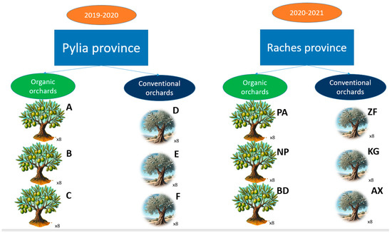 The trial was conducted in southern Greece, in the Messenia Prefecture, a region where olive cultivation is extensively practiced. The trial lasted for two growing seasons, during the year 2019–2020 in Pylia (Pila) province (36°57′0″ N, 21°44′0″ E, altitude 110 m) and during the year 2020–2021 in Raches province (37°27′86″ N, 21°71′61″ E, altitude 130 m) (Figure 1). Pylia province is characterized by typical Mediterranean climate, with an average annual rainfall of about 800 mm and mild winters. The average annual temperature is around 20 °C, with January averaging approximately 10.8 °C and July around 25.5 °C. The soils are primarily calcareous and clayey–loamy. Raches province has also a Mediterranean climate, with mild winters and warm summers, and an average annual rainfall of about 800 mm. The average annual temperature is around 21 °C, with January having an average temperature of approximately 14.9 °C and July around 26.7 °C. The soils are primarily clayey–loamy, with good drainage. At each location, three conventionally managed orchards were selected, each belonging to a different grower, along with three organically managed olive groves, each owned by a separate farmer (Figure 2). Cultivation practices were individually recorded for each olive grove. The cultivar used in all groves was “Koroneiki”, the most renowned olive oil cultivar in Greece and one of the most important olive oil cultivars worldwide, owing to its adaptability to various pedoclimatic conditions and its high productivity and supreme oil quality. The trees, ranging in age from 30 to 50 years, were fully productive. In each orchard, eight trees (organized as four replications of two trees each) were selected at the end of September based on uniform growth and production.