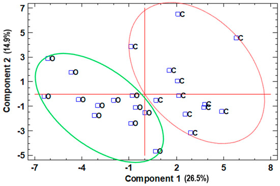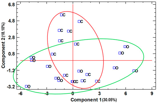Scatterplot of the principal component analysis of the raw data at harvest in Pylia province. Abbreviations: O, organic management (denoted with the green eclipse), C, conventional management (denoted with the red eclipse).