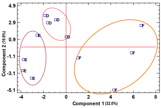 Scatterplot of the principal component analysis of the raw data of conventional orchards at harvest in Pylia province. The abbreviations (D, E, and F) represent the different olive groves (each grove is separately enclosed within one eclipse).