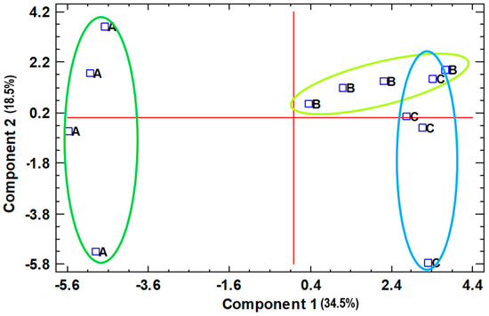 Scatterplot of the principal component analysis of the raw data of organic orchards at harvest in Pylia province. The abbreviations (A, B, and C) represent the different olive groves (each grove is separately enclosed within one eclipse).