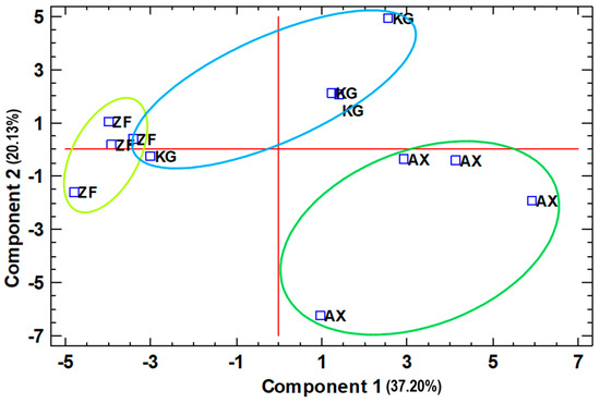 Scatterplot of the principal component analysis of the raw data of conventional orchards at harvest in Raches province. The abbreviations (ZF, KG, and AX) represent the initials of the farmers responsible for each olive grove (each grove is separately enclosed within one eclipse).