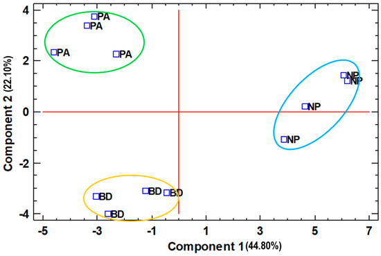 Scatterplot of the principal component analysis of the raw data of organic orchards at harvest in Raches province. The abbreviations (PA, NP, and BD) represent the initials of the farmers responsible for each olive grove (each grove is separately enclosed within one eclipse).