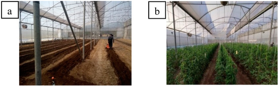 The experiment was set up in a semi-automatic greenhouse of the Israelite type without forced ventilation in an area of 1000 m2; the fertigation system consists of water flow doses by tape. The soil preparation (Figure 1a) consists of semi-conventional tillage (subsoiling, plowing, and harrowing every 3 agricultural cycles) and tillage with roto-cultivation; the border is of the seedbed type; the varieties of indeterminate tomato (Solanum lycopersicum L.) were ¨El Potosí¨ of the saladette type and ¨El Arameo¨ of the beef type (Figure 1b). Seed propagation was carried out in propagation trays, with transplanting 35 days after sowing; the seedling was treated with fungicide (carbendazim), insecticide (imidacloprid) and fertilizer (propamocarb hydrochloride) in doses of 1, 1.5, and 1 mL L−1, respectively, as well as 1 g L−1 of 12-43-12 fertilizer (to the seedling root beef) in 10 L of water.