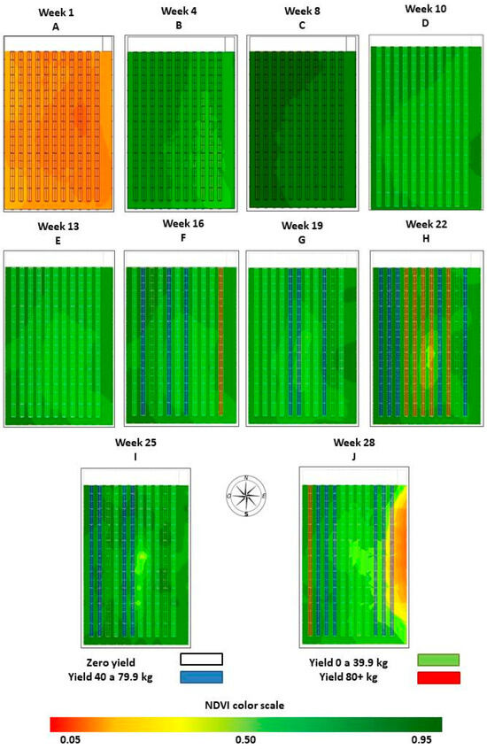 A database was generated with the information obtained from NDVI values acquired by the Green Seeker® TM optical sensor (Model HCS-100, 2012, Trimble Inc., Sunnyvale, CA, USA). Systematic monitoring was initiated 5 days after transplanting, repeated every 7 days, and ended 211 days later (28 weeks). NDVI values were plotted on thematic maps using the simple Kriging method of plant growth between beds and yield per section.