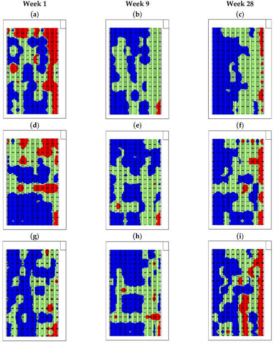 NDVI thematic maps were created using qGis v.3.38.2 software and the simple Kriging method. This allows for calculating a specific point’s value based on neighboring points’ values. Each section is represented by the average NDVI value readings on a color scale ranging from 0.0 (red color) to a shade of dark green (representing values close to 1), through orange and yellow for average values (at 0.05 intervals). At the same time, yield values were extracted in kg per week for each bed, being classified as no yield (no color), 0.0–39.9 kg (green), 40–79.9 kg (blue), and 80 kg (red). In addition, all values were used to correlate NDVI with yield in both varieties of tomato.