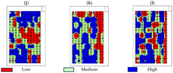 Thematic maps of (a–c) height; (d–f) length leaf; (g–i) width leaf; (j–l) stem.