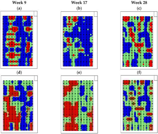 Thematic maps of (a–c) number of bunches; (d–f) number of fruits.