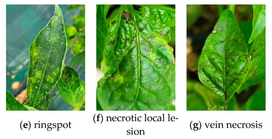 Symptoms of TSWV infection in peppers vary widely and include vein clearing, leaf curling, mosaic patterns, chlorosis, stem necrosis, and ring spots. The severity and manifestation of these symptoms differ among individual plants, depending on the type of plant and its growth stage [22]. Other viruses, such as cucumber mosaic virus (CMV), can also cause similar symptoms, complicating the diagnosis of TSWV based solely on visual observations. This study aims to tackle these diagnostic challenges using image-based machine-learning techniques to determine TSWV infection status. There is a need to reduce reliance on subjective human judgment and to adopt more objective and accurate evaluation methods.